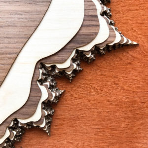 For this piece I calculated the boundaries between different rates of divergence of the Mandelbrot set. I cut those boundaries into alternating layers of maple and walnut hardwood, stacked them together, and now I have a beautiful 3-dimensional Mandelbrot set. Woo!
